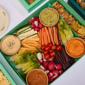 Cajita XL de 4 tipos de dips con crudités, totopos y tostas