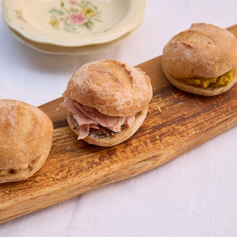 Bocatín de mortadela trufada, tomate seco, queso crema y rúcula (10 unidades)