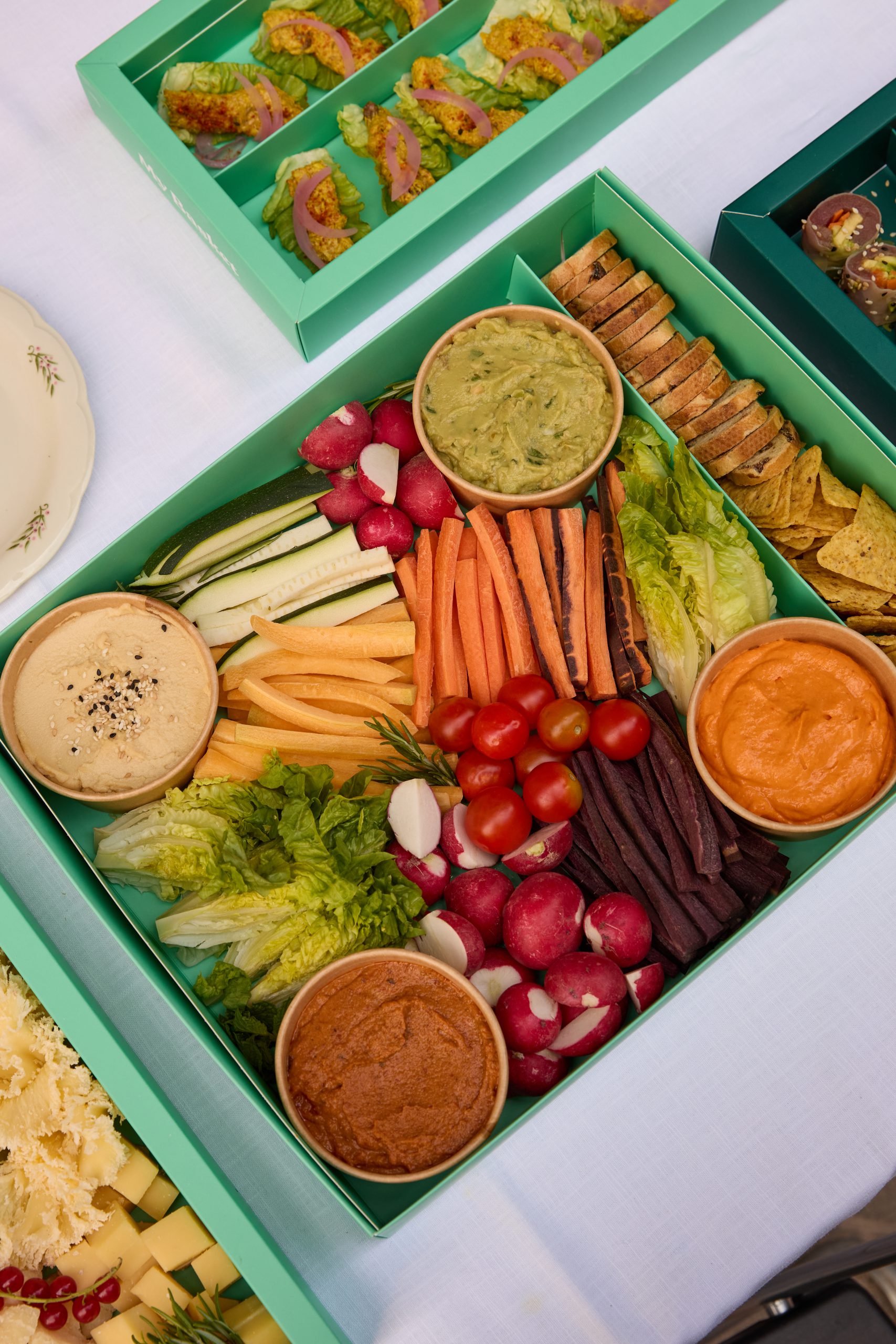 Cajita XL de 4 tipos de dips con crudités, totopos y tostas