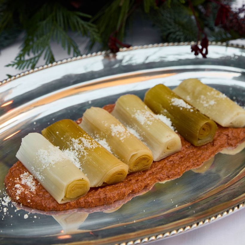 Puerros confitados con romesco de tomate seco y orégano (4 raciones. Contiene 12 unidades)