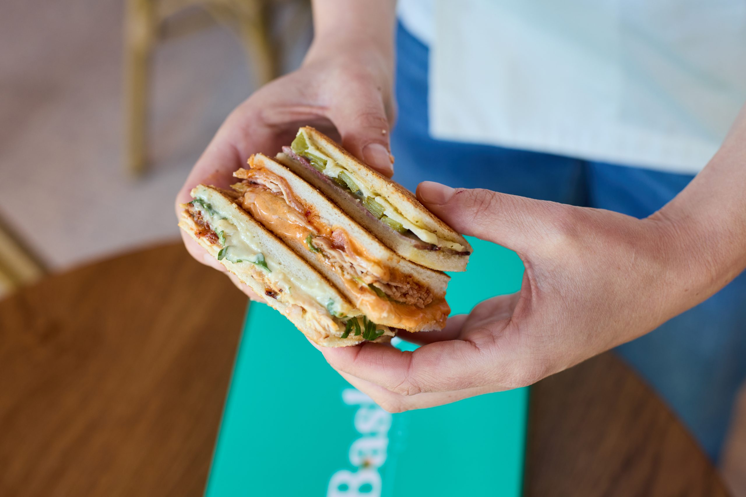 My Basket x New York burger. Contiene 12 sandwiches variados: Pavo-Bacon spicy, Pastrami y pepinillos, Pavo cesar y tomate seco.